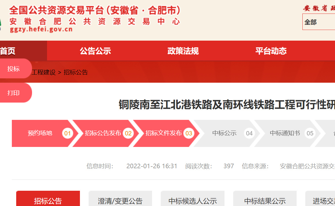 1月26日,工可招標(biāo)文件在省交易中心順利掛網(wǎng)招標(biāo)。銅陵南至江北港鐵路及南環(huán)線鐵路工程項(xiàng)目是銅陵市鐵路網(wǎng)的重要組成部分。該線路自銅陵南站接出,沿銅九鐵路東側(cè)向南敷設(shè),依次下穿銅九鐵路、寧安高鐵,沿京臺高速與民福家園之間北行,跨過既有京臺高速,經(jīng)G3銅陵長江公鐵大橋過江,西行至陳瑤湖鎮(zhèn),設(shè)銅陵江北站,后線路折向南,區(qū)間接軌于在建江北港鐵路專用線,引入江北港站,線路全長27.579km。南環(huán)線由銅陵南至江北港鐵路區(qū)間新建線路所接軌,后線路繼續(xù)北行,跨過濱江大道后接入海螺水泥廠專用線,新建線路長度2.958km。項(xiàng)目總估算是268531.12萬元。