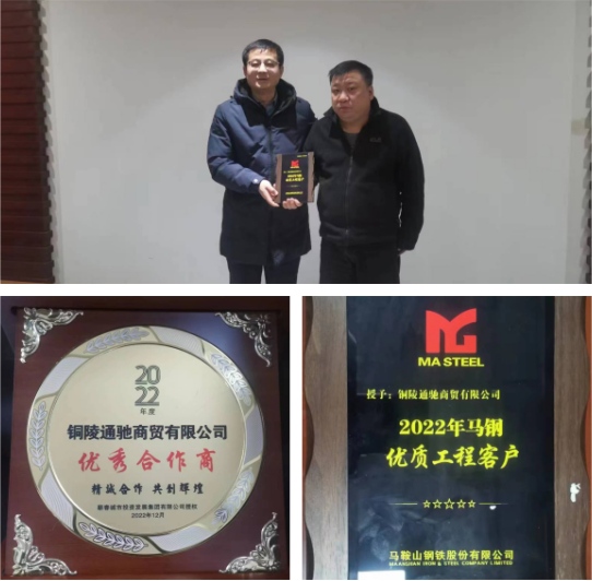 2023年2月10日,通馳商貿(mào)公司憑借精質(zhì)的服務(wù)在眾多供應(yīng)商中脫穎而出,榮獲馬鋼公司2022年度“優(yōu)質(zhì)工程客戶”稱號。馬鋼公司營銷中心市場分析師、首席營銷師夏仕卿特赴公司現(xiàn)場授牌并調(diào)研相關(guān)工作。