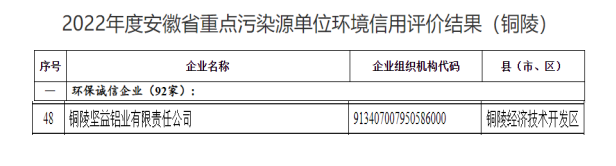 10月9日,市生態(tài)環(huán)境局對2022年度“安徽省重點(diǎn)污染源單位環(huán)境信用等級評價結(jié)果”予以公布,市交投集團(tuán)司屬堅(jiān)益鋁業(yè)公司經(jīng)過層層評選,成功榮獲“環(huán)保誠信企業(yè)”稱號。據(jù)悉獲評該項(xiàng)榮譽(yù)我市共計(jì)92家企業(yè)。