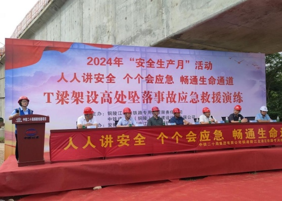 6月25日下午,江北港鐵路專用線有限責任公司聯(lián)合中鐵建長江(銅陵)港鐵建設運營有限公司,在江北港鐵路專用線項目黃泥河特大橋68#墩附近舉辦T梁架設高處墜落事故應急演練。本次演練由江北港鐵路專用線公司董事長、總經理張葉來擔任總指揮,中鐵二十局項目經理部安全總監(jiān)鐘健任現(xiàn)場指揮,廬江縣應急管理局總工程師顧德祥、廬江縣發(fā)改委總工程師朱雷、泥河鎮(zhèn)人民政府黨委副書記高磊受邀蒞臨現(xiàn)場指導點評。江北港鐵路專用線公司安全質量部、工程管理部,上海先行項目監(jiān)理部,中鐵十六局、中鐵二十局項目經理部相關人員參加活動。