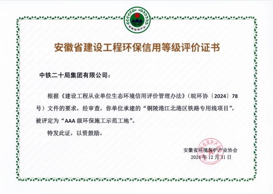 近日,安徽省環(huán)境保護(hù)產(chǎn)業(yè)協(xié)會公布2024年第5批建設(shè)工程從業(yè)單位生態(tài)環(huán)境信用評價結(jié)果,銅陵江北港鐵路專用線項目榮獲安徽省“AAA級環(huán)保施工示范工地”榮譽(yù)稱號。