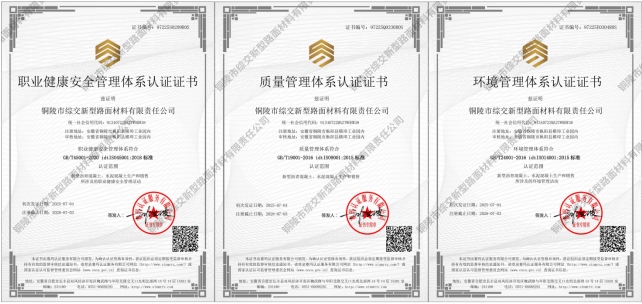 近日,綜交新型路面材料公司順利取得ISO“三體系”(ISO9001質(zhì)量管理體系、ISO14001環(huán)境管理體系、ISO45001職業(yè)健康安全管理體系)認證證書,這是我司在提升企業(yè)綜合實力過程中取得的新進展,標志著我司在精細化、制度化、規(guī)范化管理方面邁上了新臺階。