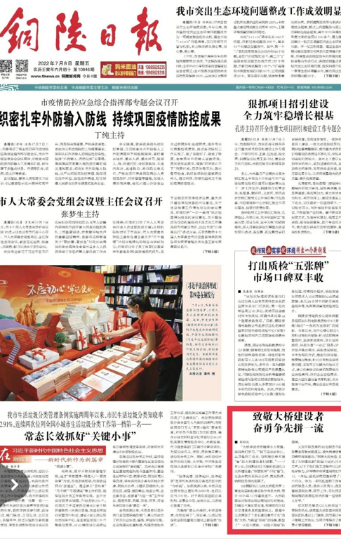 7月8日,《銅陵日?qǐng)?bào)》刊登報(bào)道了《致敬大橋建設(shè)者 奮勇爭先拼一流》。詳情如下↓↓