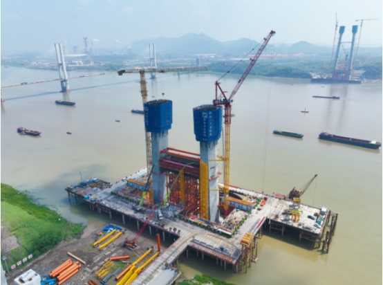澆筑這樣一個(gè)巨大的“肩膀”一共需要2281立方米混凝土,分2層澆筑?!八┕な讋?chuàng)9米節(jié)段智能液壓爬模,把大橋主塔柱單次澆筑高度從傳統(tǒng)的6米一節(jié)躍升至9米一節(jié),不僅節(jié)省了大量的鋼筋接頭,而且在施工時(shí)間上較6米節(jié)段施工減少了12個(gè)輪次,提高了施工效率,這是橋梁施工工藝?yán)锍瘫降耐黄?!”中鐵大橋局G3銅陵橋項(xiàng)目部一分部副經(jīng)理沈堅(jiān)羽介紹。
