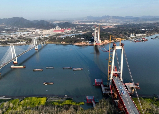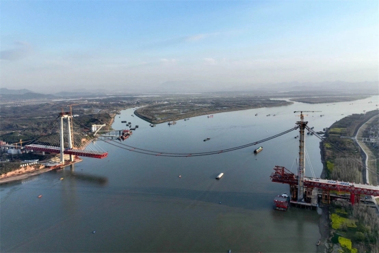3月21日,中鐵大橋局施工機(jī)械在G3(京臺(tái)高速)銅陵長(zhǎng)江公鐵大橋架設(shè)中跨鋼梁。
