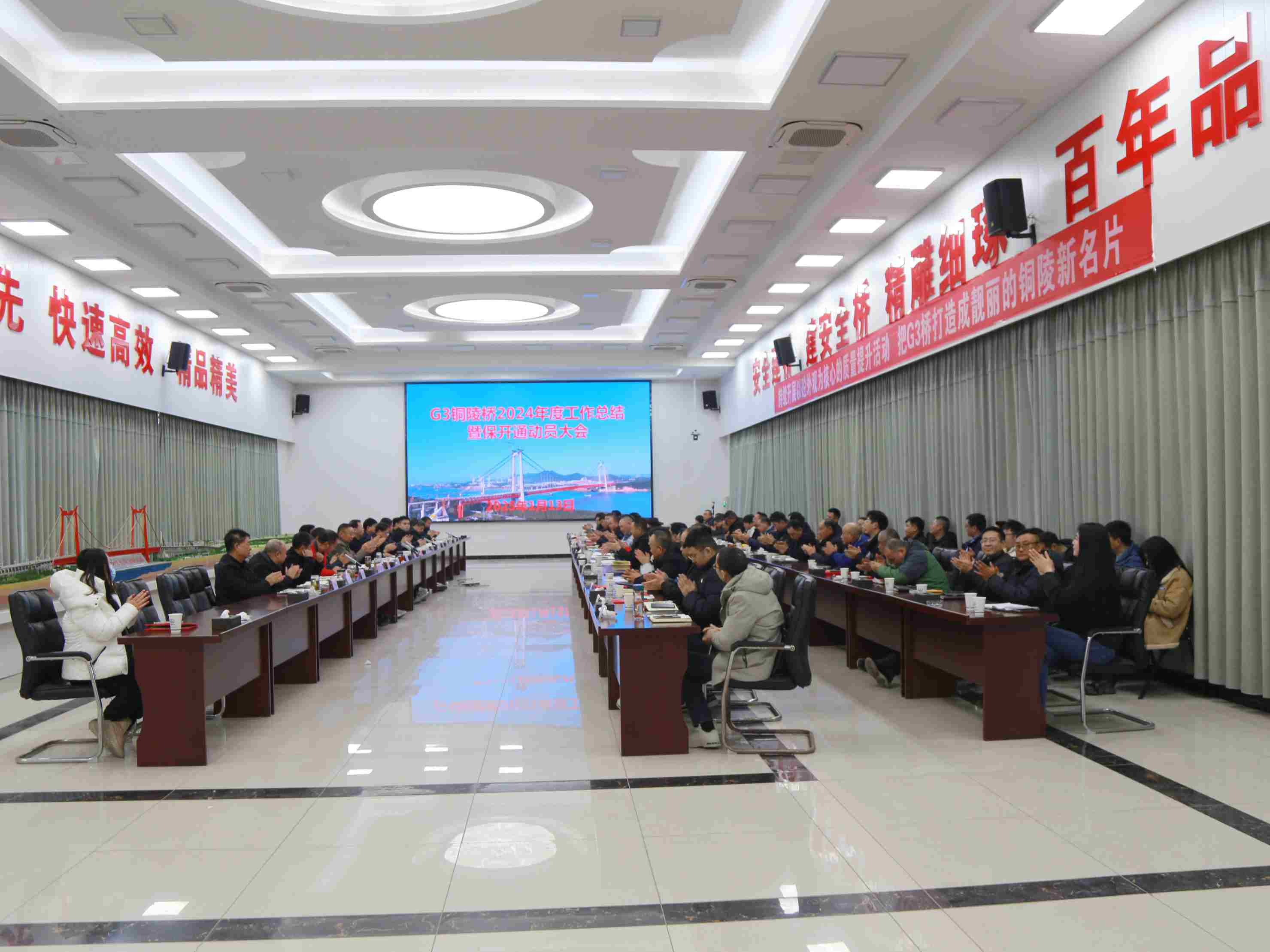 2025年1月13日下午,G3銅陵長江公鐵大橋項目部會議室隆重召開“G3銅陵長江公鐵大橋2024年度工作總結暨2025年保通動員活動大會”。集團公司黨委副書記、總經理龍道寧,集團公司黨委委員、副總經理湯世才出席會議,中鐵大橋局集團副總經理羅兵,中鐵大橋局四分公司黨委書記、執(zhí)行董事王立忠,中鐵大橋局G3橋項目總指揮劉幸福,以及各參建單位相關負責人參加會議。