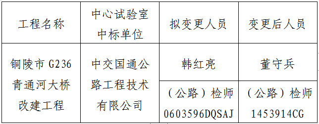 銅陵市G236青通河大橋改建工程中心試驗(yàn)室,于2019年9月29日開標(biāo),中標(biāo)單位為中交國(guó)通公路工程技術(shù)有限公司。因原中標(biāo)項(xiàng)目負(fù)責(zé)人個(gè)人家庭原因,無(wú)法到崗履行合同責(zé)任與義務(wù),故中交國(guó)通公路工程技術(shù)有限公司申請(qǐng)中心試驗(yàn)室項(xiàng)目負(fù)責(zé)人變更。現(xiàn)將項(xiàng)目負(fù)責(zé)人變更情況予以公示,如有異議,請(qǐng)于7日內(nèi)向銅陵市綜合交通投資集團(tuán)有限公司反映。