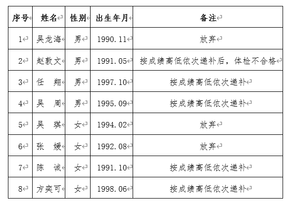 因出現(xiàn)部分考生自愿放棄情況,我公司對(duì)入圍體檢人員按照成績(jī)排名依次進(jìn)行遞補(bǔ)?,F(xiàn)將交投集團(tuán)司屬公司銅陵市江北公路管理有限責(zé)任公司收費(fèi)員、監(jiān)控員崗位招聘遞補(bǔ)入圍體檢人員名單公告如下: