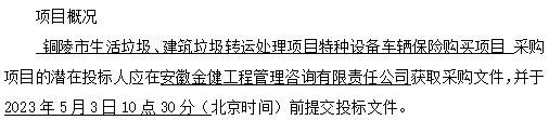 項(xiàng)目名稱:銅陵市生活垃圾、建筑垃圾轉(zhuǎn)運(yùn)處理項(xiàng)目特種設(shè)備車輛保險(xiǎn)購(gòu)買項(xiàng)目