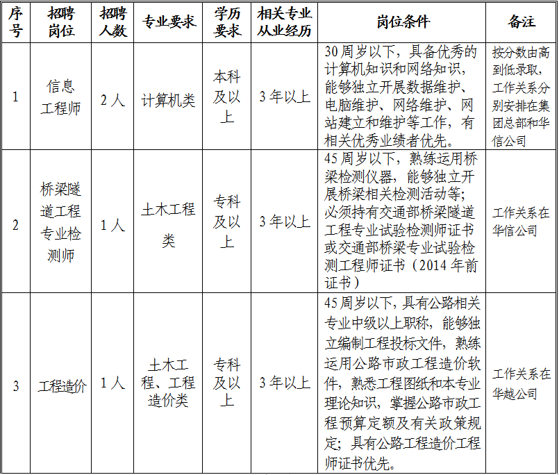 2.報(bào)名方式:采取網(wǎng)上投遞簡歷方式報(bào)名,凡有意應(yīng)聘上述招聘崗位且符合崗位要求的人員,請(qǐng)將報(bào)名表、個(gè)人簡歷、有關(guān)證件掃描件(學(xué)歷證書、職稱證書、職(執(zhí))業(yè)證書、身份證等)發(fā)至報(bào)名郵箱:4060356@qq.com,或郵寄地址:銅陵市北京北斗星城3-C6C7棟1102號(hào)(銅陵市綜合交通投資集團(tuán)有限公司收)。