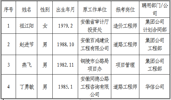 根據(jù)《銅陵市交通投資有限責(zé)任公司招聘人員公告》,現(xiàn)將道路工程師、造價工程師、項(xiàng)目管理擬聘用人員名單公示如下: