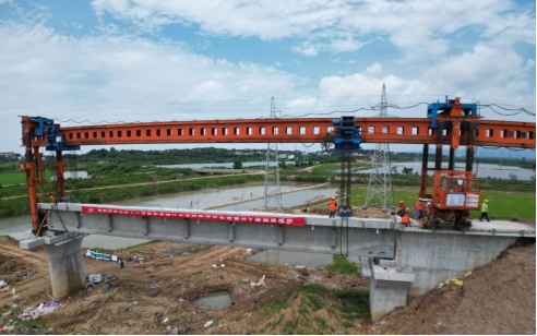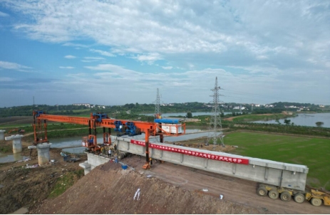 7月6日上午10點10分,在銅陵港江北港區(qū)鐵路專用線項目施工現(xiàn)場,隨著全線首片長32米,重140噸的預(yù)制T梁平穩(wěn)精準架設(shè)在章家院特大橋0號臺至1號墩上,標志著江北港鐵路專用線項目首片T梁架設(shè)成功,橋梁架設(shè)施工正式拉開帷幕,項目建設(shè)駛?cè)肟燔嚨馈?